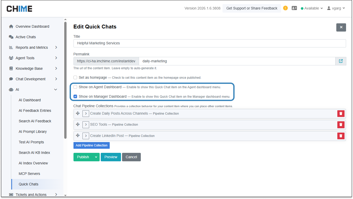QuickChat – Agent and Manager Dashboard Links – QuickChat content items can now be surfaced directly in the Agent and Manager dashboards by prefixing their names with “(Agent)” or “(Manager)”, enabling role-specific shortcuts in the sidebar.