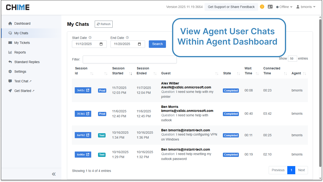 A new Agent Chat History page shows all chats the agent personally handled, giving them a complete view of their recent work. Dashboard navigation has been updated so these pages are easier to access in daily workflows.