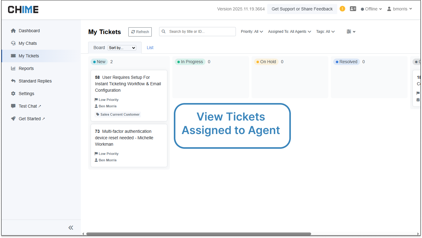 The new My Tickets board shows tickets assigned directly to the logged-in agent, along with an agent-specific editor and clearer ticket actions. Agents can update lanes, publish changes, and work through assigned items more efficiently — even without full ticketing permissions.