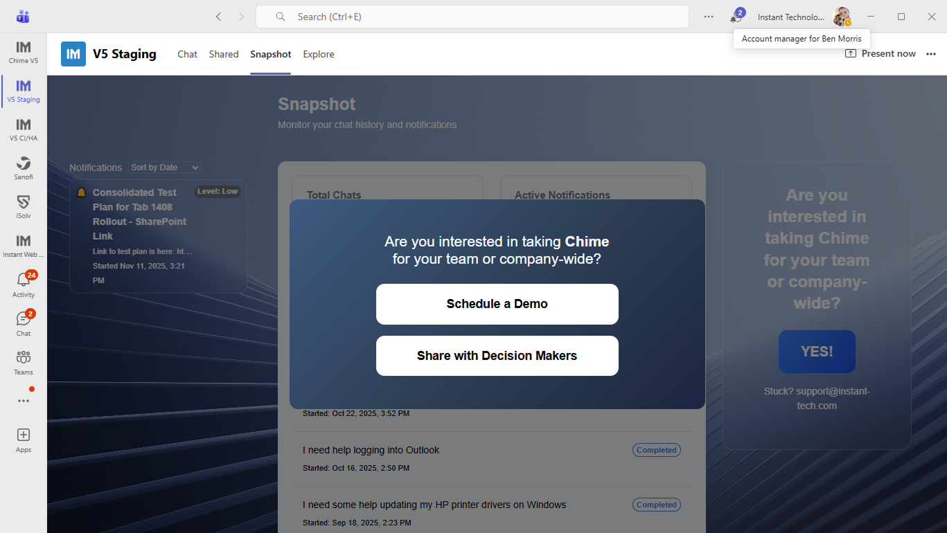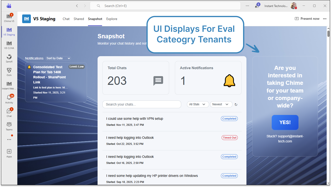 The marketing card is now placed at the top of both tabs, and its visibility follows tenant category logic — shown for Guest and Eval tenants and hidden for Production tenants. The Snapshot tab now loads more smoothly, starts all notification counts at 0 for accuracy, and includes improved error handling for a more stable user experience. Eval tenants also gain a new “Share with Decision Maker” button that makes it easy to escalate key information internally.